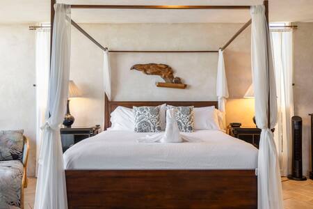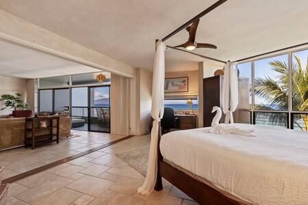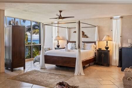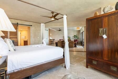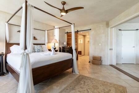 King canopy bed with premium linens and a luxurious oversized en-suite bath featuring dual-sink vanity, custom walk-in shower, and plenty of storage — plus stunning ocean views.