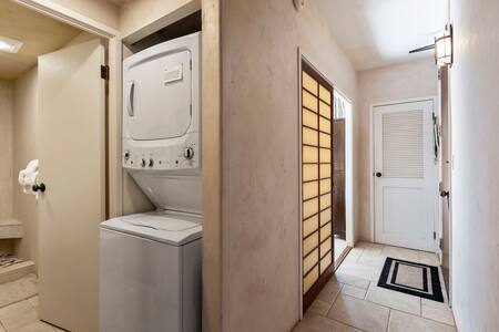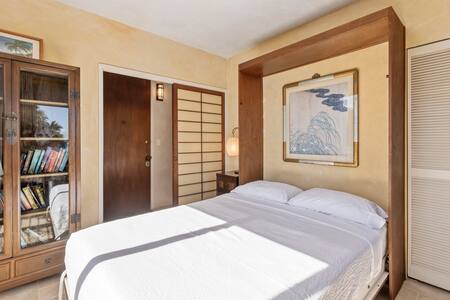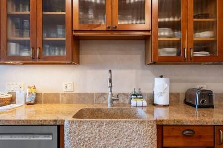Remodeled kitchen with stainless appliances, breakfast bar, and all essentials provided. The primary suite connects to the living area and can be closed off by a pocket door for privacy.