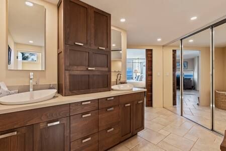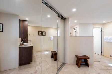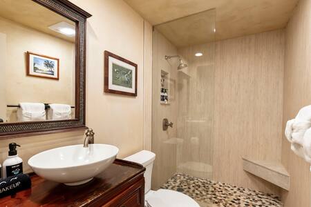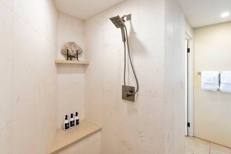 Queen bed with closet storage and en-suite bathroom featuring a beautifully remodeled walk-in shower and modern single-sink vanity.