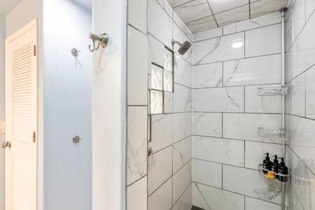 King bed with premium linens, ceiling fan, closet, and en-suite bath featuring custom walk-in shower, single-sink vanity, and washer/dryer.