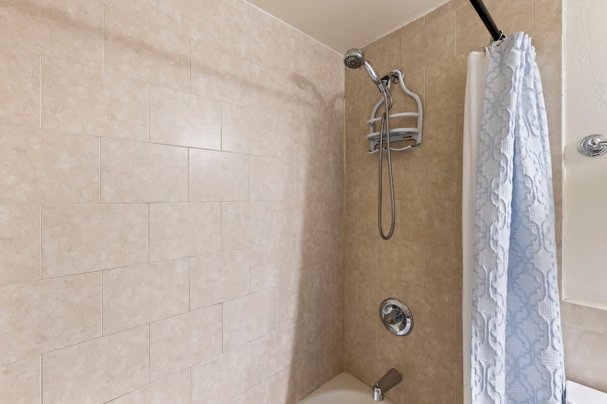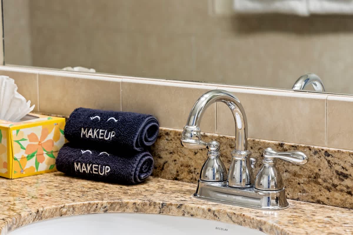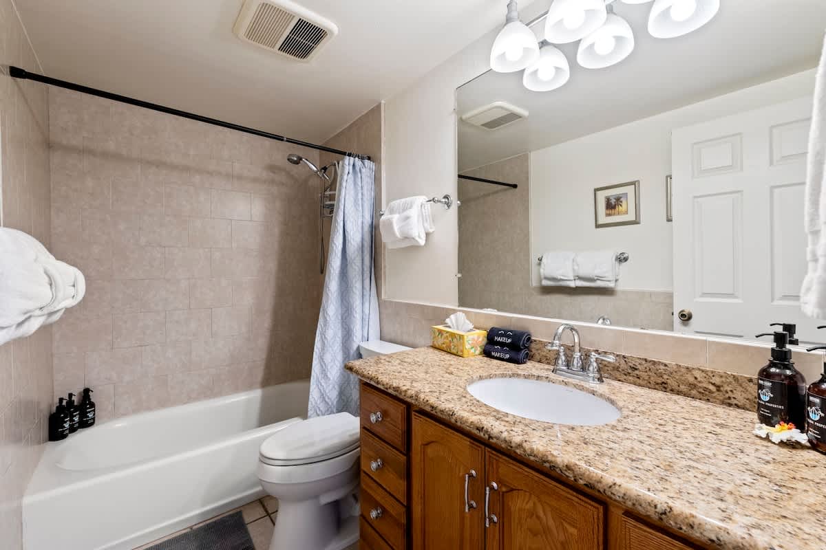 Bathroom: Tub/shower combo, single vanity sink, fresh towels, and luxury organic bath products courtesy of Stay Aloha.