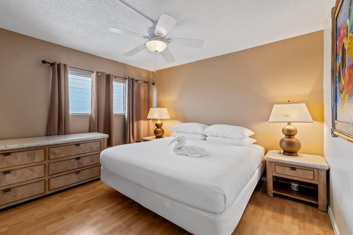 Bedroom: King-size bed, ceiling fan, nightstands with USB chargers, drapes, and ample closet space.