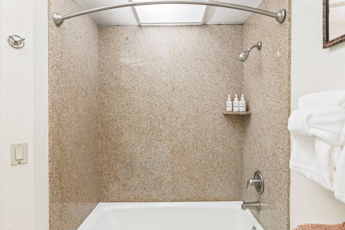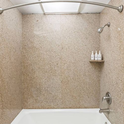 Remodeled bathroom with tub/shower combo, single vanity with storage, and plush towels.