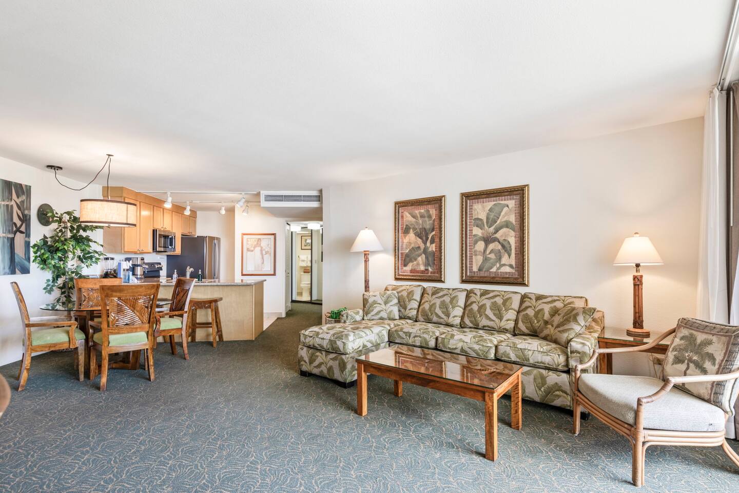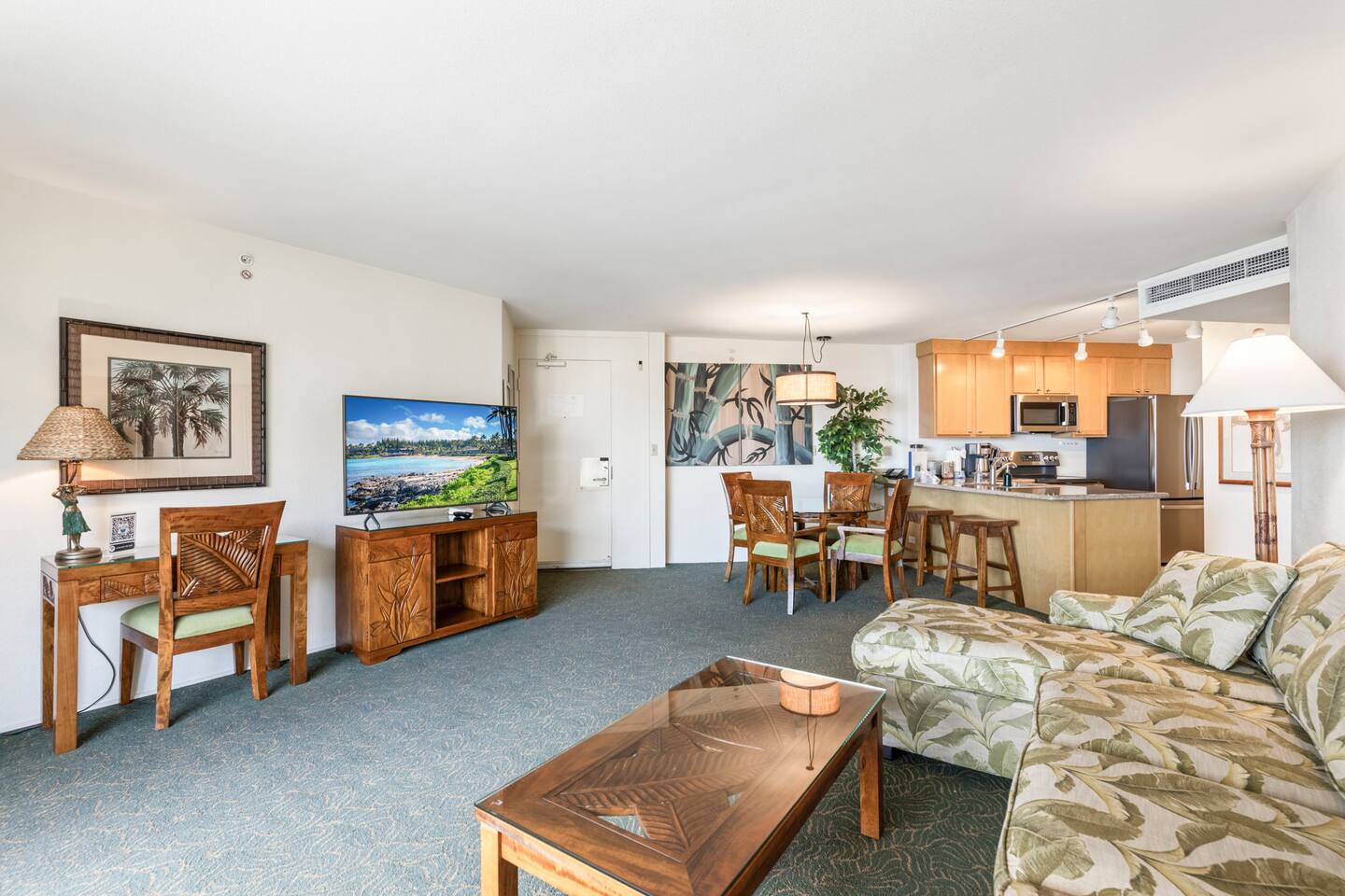 Open floor plan with updated kitchen, dining table for 4, breakfast bar with 2 stools, Smart TV with cable, and a pull-out sofa sleeper. Tropical decor with clean, classic Hawaiian style.