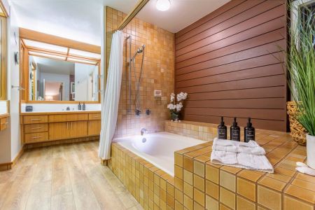 En suite bathroom: soaking tub/shower combo, single vanity, and extra storage.