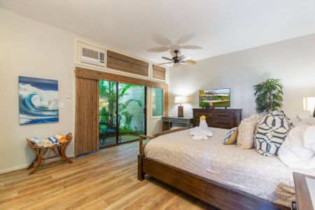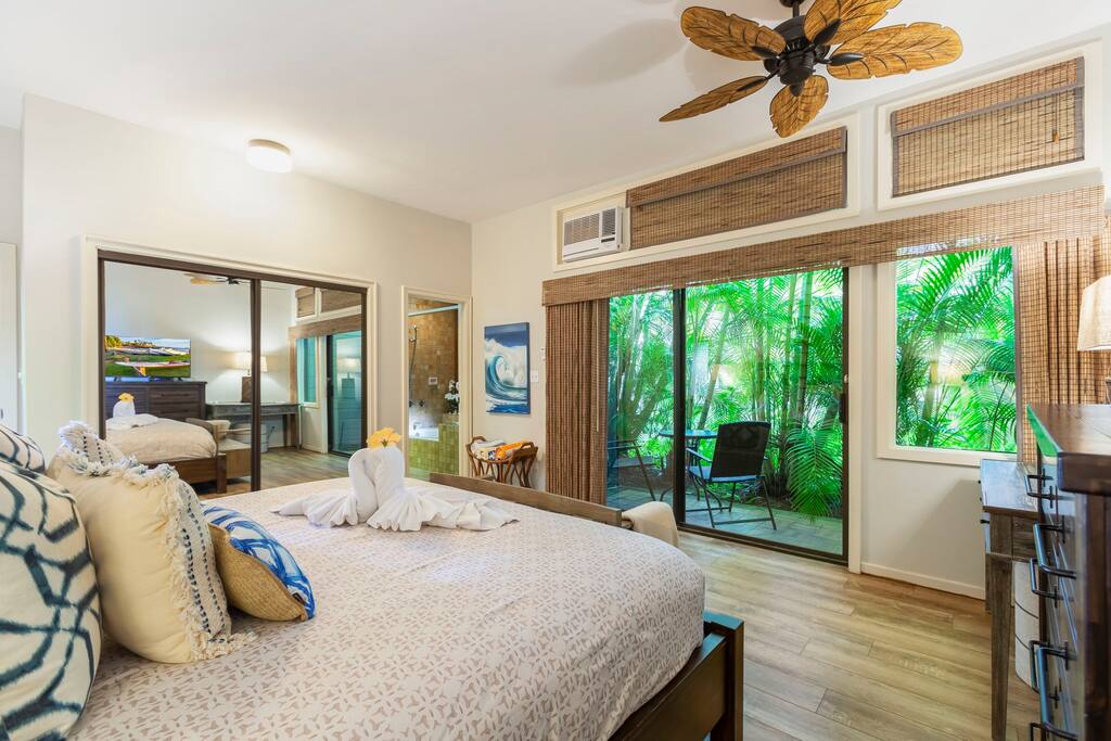 King bed with premium linens, Smart TV with cable, desk/workspace, window A/C unit, dresser, and ample closet space. Private lanai with garden and ocean views.