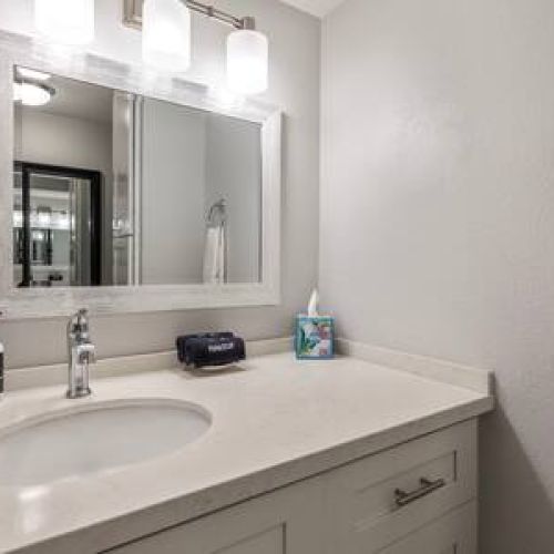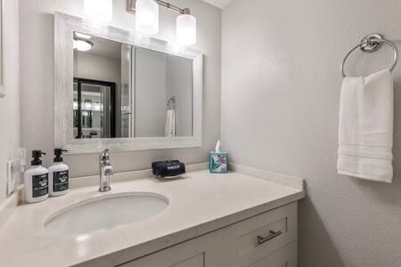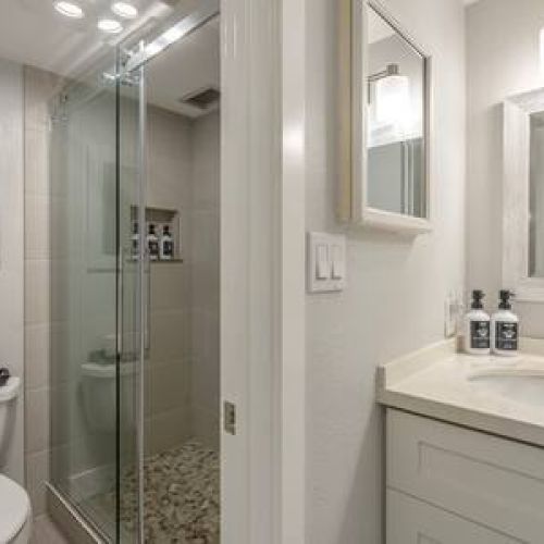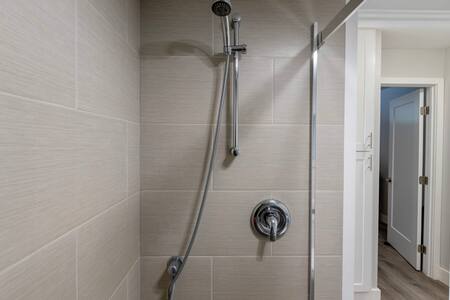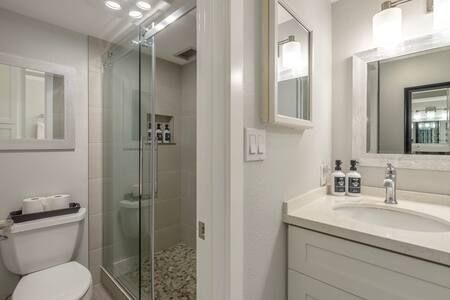 Bathroom: Beautifully remodeled with a custom walk-in shower, single-sink vanity, and modern fixtures.