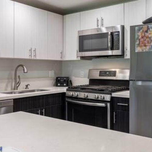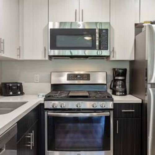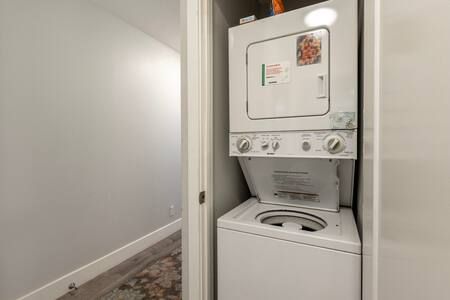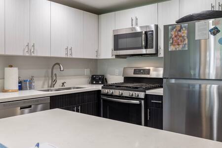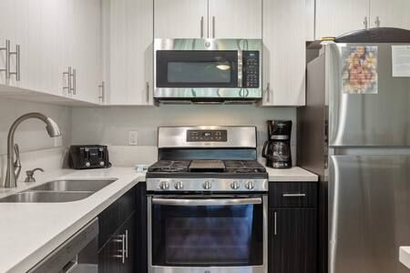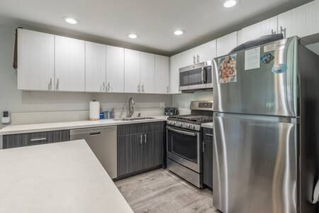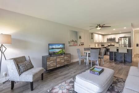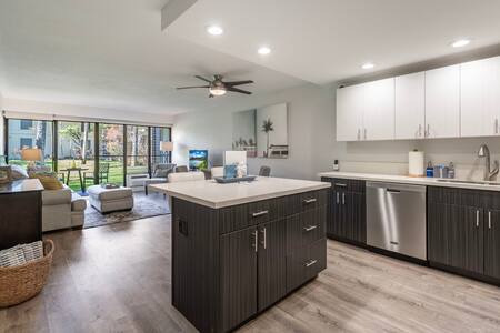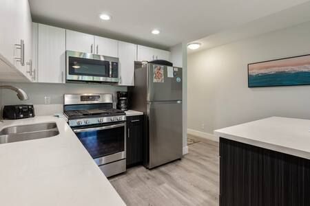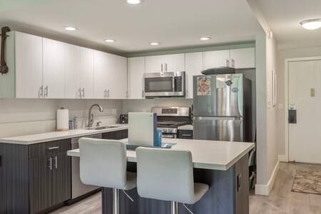 Living Area: Open floor plan with fully equipped kitchen, quartz countertops, stainless appliances, breakfast bar (2 stools), dining table, Smart TV with cable, queen sofa sleeper with linens, window A/C system, ceiling fan, and comfortable seating. In-unit washer/dryer for your convenience.