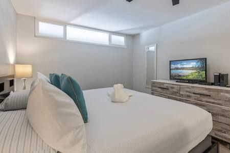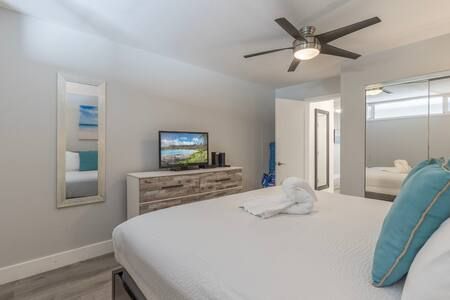 Bedroom: King-size bed, ceiling fan, Smart TV with cable, USB chargers on nightstands, and closet storage.