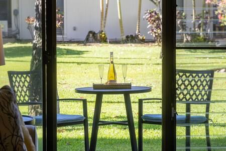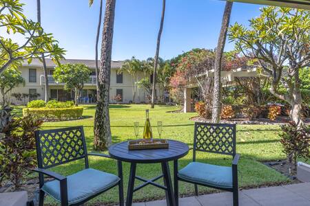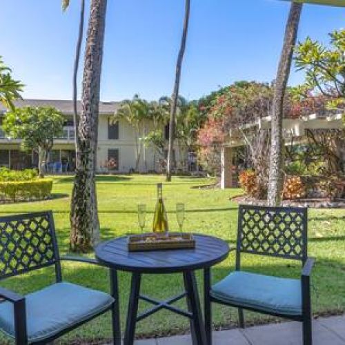 Lanai: Private garden-view lanai with bistro table and chairs. Includes beach gear for your use — chairs, umbrella, and small cooler (no snorkel gear). Please rinse off sand before returning items to the unit.