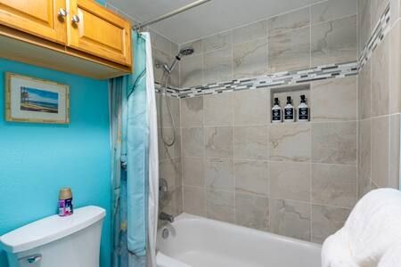 Bathroom: Full bathroom with tub/shower combo, single-sink vanity, and fresh towels.