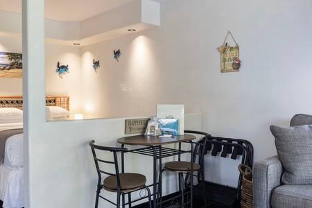 Studio Layout: Open-concept space with a fully equipped kitchen, dining table (2 chairs), Smart TV with cable, queen-size bed, queen sofa sleeper with linens, window A/C unit, ceiling fan, and in-unit washer/dryer.