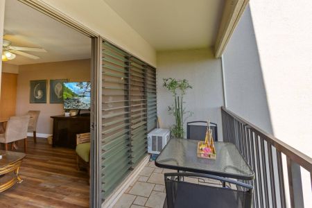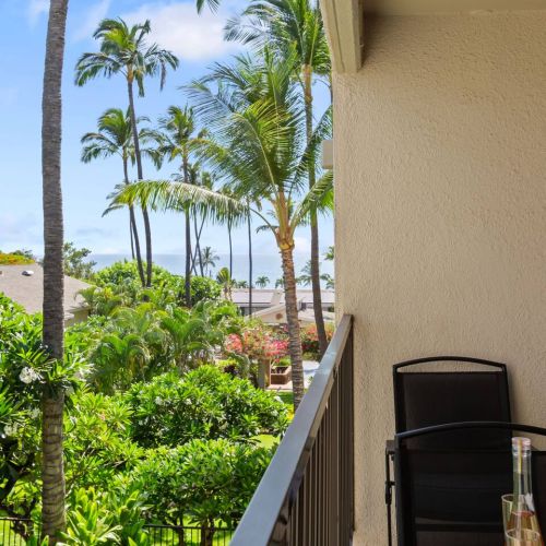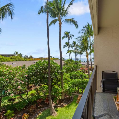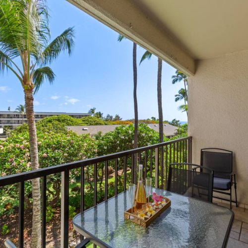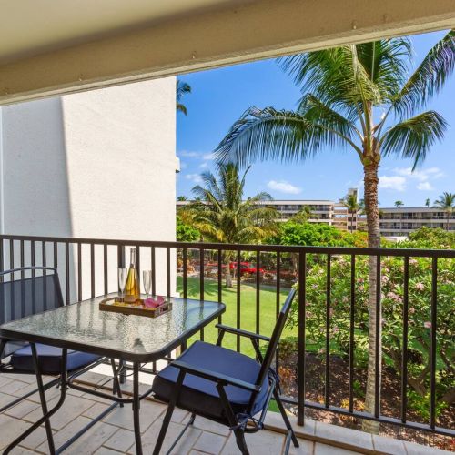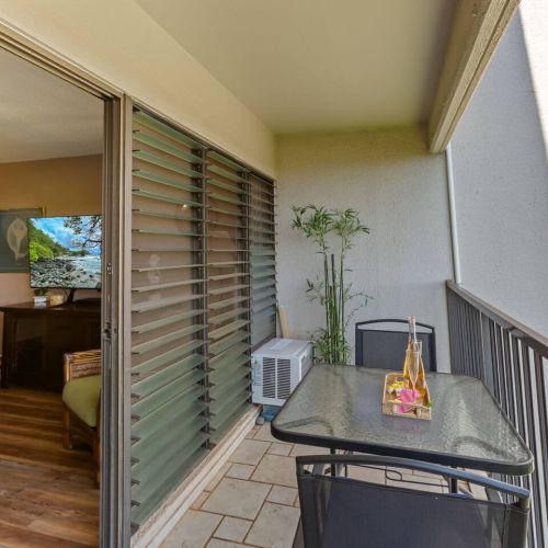 Lanai: Bistro table with 2 chairs and partial ocean view — the perfect spot for morning coffee or sunset relaxation.