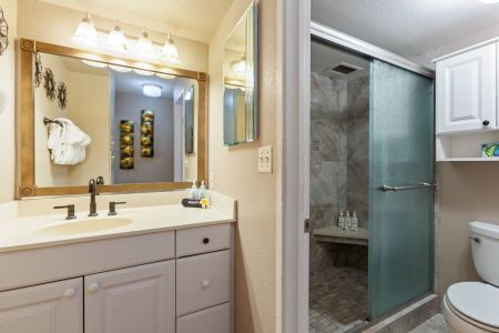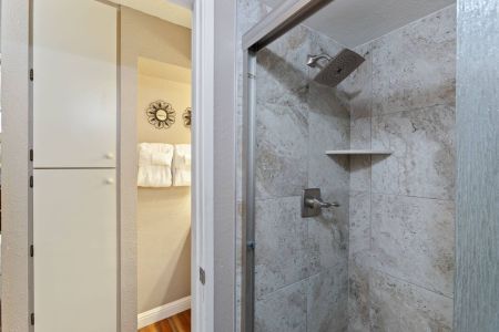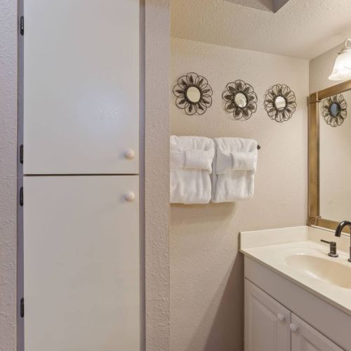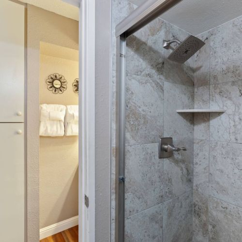 Bathroom: Walk-in shower, single sink vanity, and fresh towels.