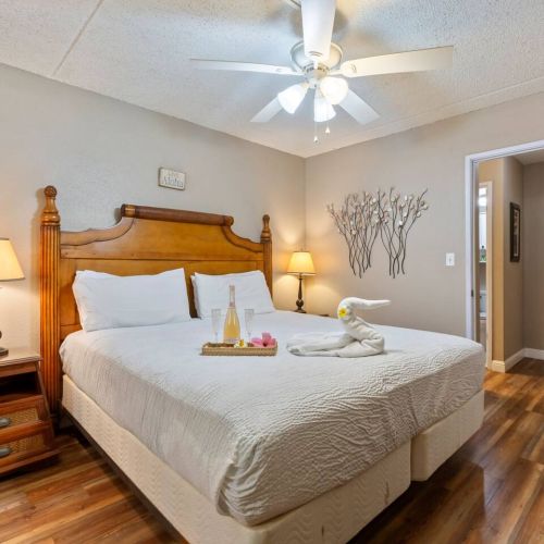 Bedroom: King-size bed, ceiling fan, USB chargers on nightstands, and closet space (no A/C unit in bedroom).