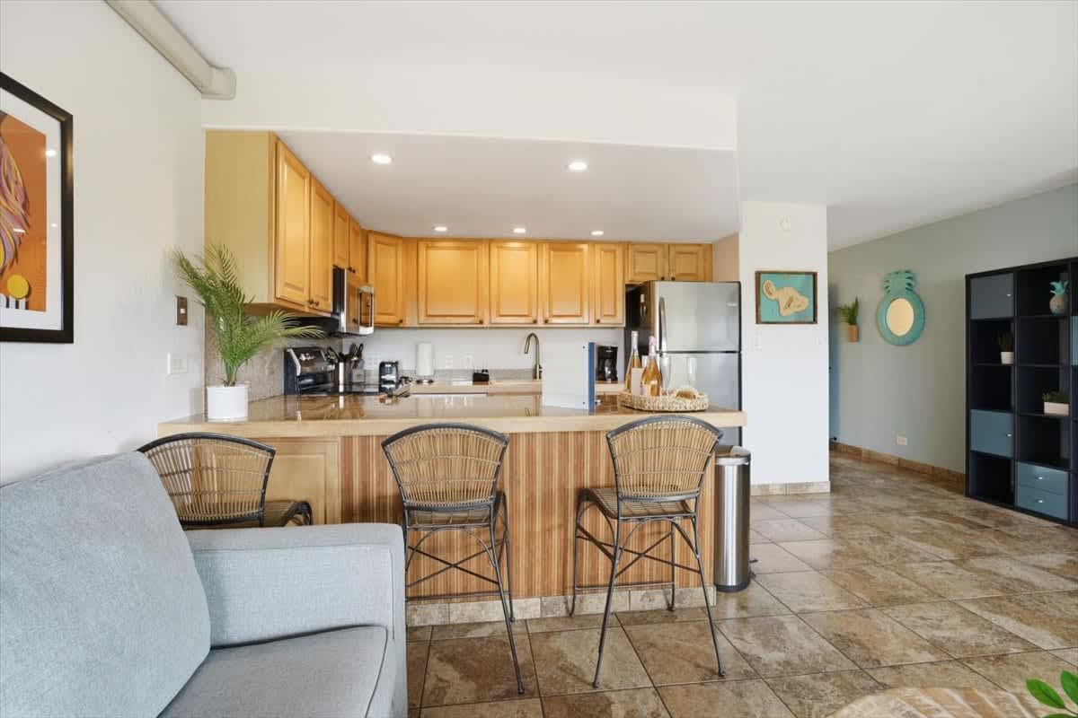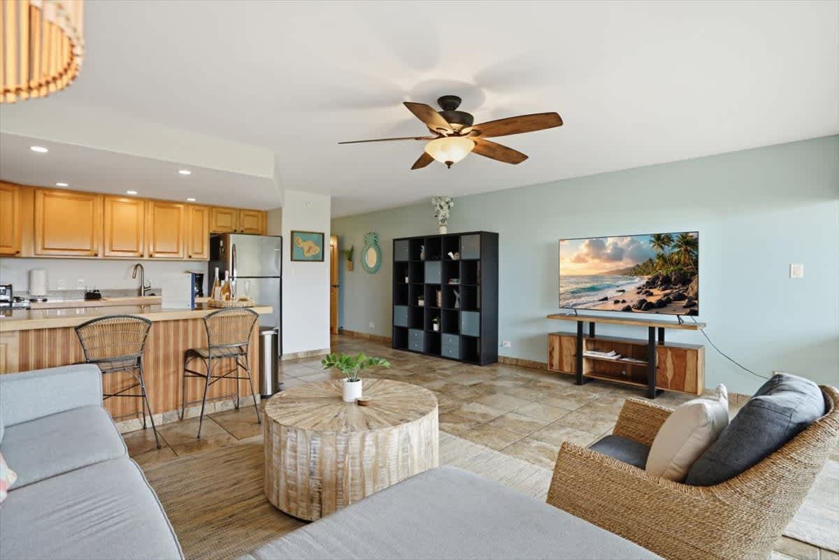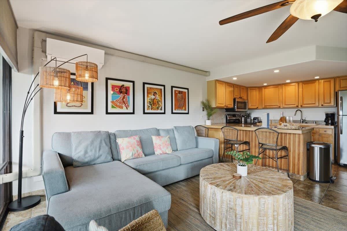 Welcome to Kihei Alii Kai B108. This beautifully remodeled 2 bedroom, 2 bathroom condo can accommodate 6 people. Keep cool year round with Split AC units in the living room & the bedrooms. The condo has a fully equipped kitchen, towels & linens, & beach gear for your use. This condo is perfectly located right in the middle of beautiful Kamaole I & II beach. There are also shops & dining right below the complex at Dolphin Plaza. Free Parking & No resort fees. Make your maui memories at KAK B108!