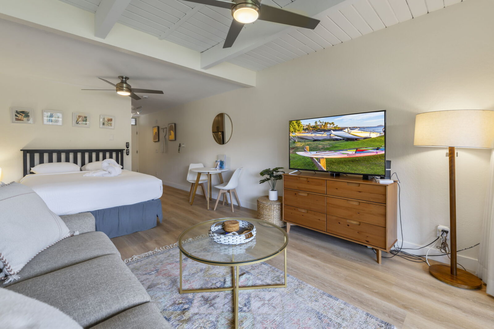 Coastal design with light finishes and open flow. Features a queen bed, sofa sleeper, Smart TV with premium cable, window A/C, ceiling fan, and bistro table for 2.