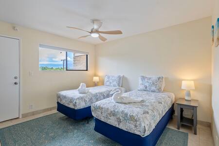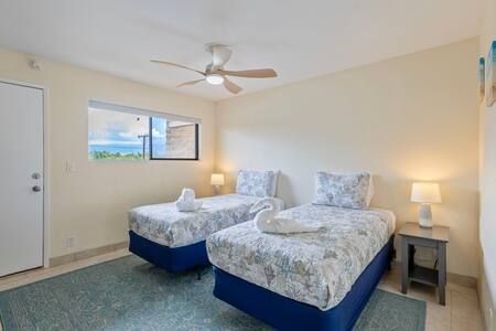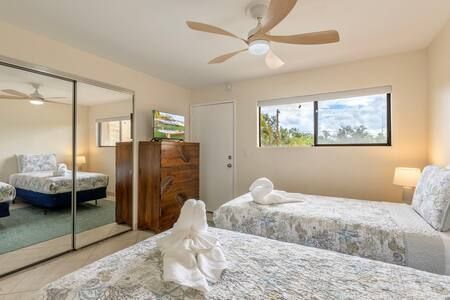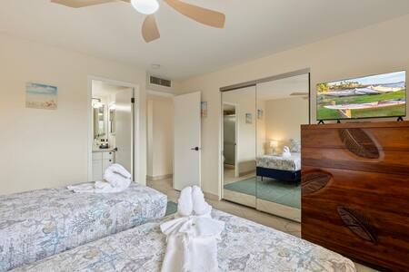Bedroom 2: Two twin beds that can be converted to a King (please arrange this setup at booking — not same-day). Includes central A/C, ceiling fan, TV, and closet space.