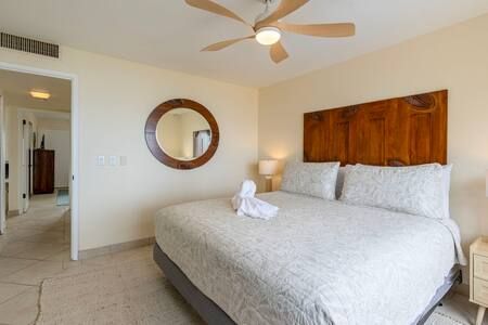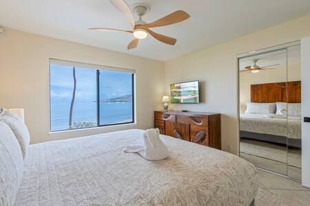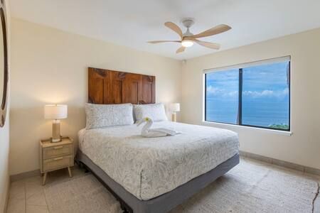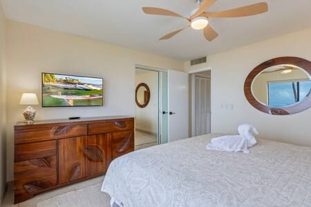 Bedroom 1: King bed, central A/C, ceiling fan, TV, closet space, and ocean view.