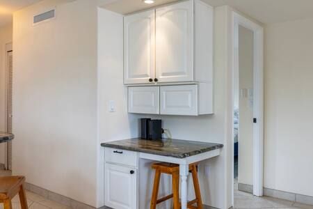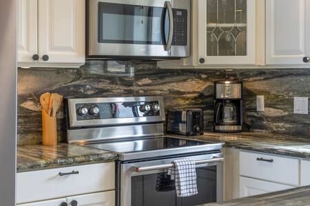 Living Area: Bright, open-concept living space featuring central A/C, ceiling fan, Smart TV (cable), sofa sleeper, dining table for 4, breakfast bar for 2, and cozy sitting chairs. The kitchen is fully equipped with upgraded stainless appliances, cookware, and essentials for dining in.