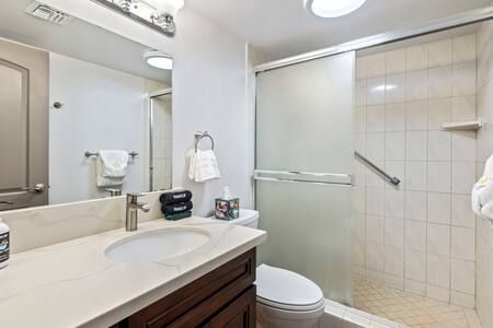 • Bathroom 1: Walk-in shower, toilet, and single-sink vanity.