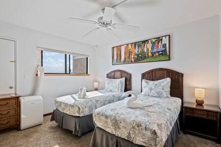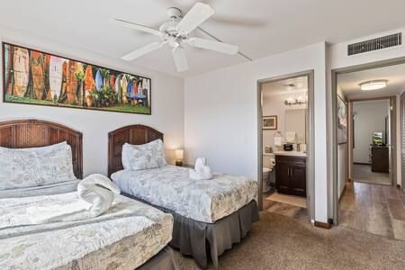 Bedroom 2: Two twin beds that can convert to a King (please request at booking — not same-day). Also includes central A/C, ceiling fan, TV, and closet space.