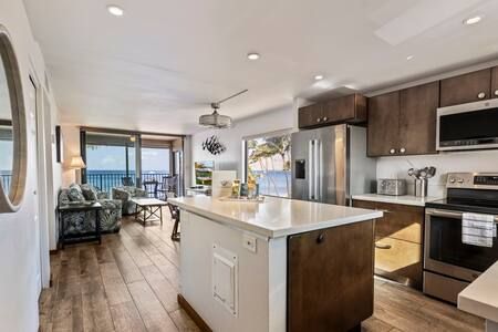 Living Area: Open-concept ocean-view living room with Smart TV (cable), ceiling fan, central A/C, sofa sleeper, dining table for 4, breakfast bar for 2, and sitting chairs. Modern kitchen features upgraded stainless appliances and everything needed for cooking at home.