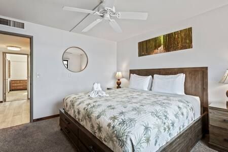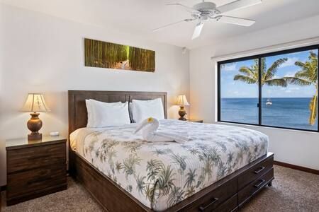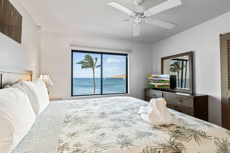 Bedroom 1: King bed, central A/C, ceiling fan, TV, closet space, and direct ocean views.