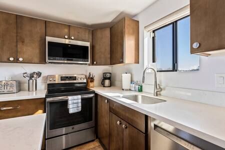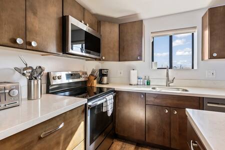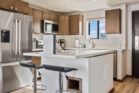 • Modern kitchen with stainless appliances, quartz counters & breakfast bar