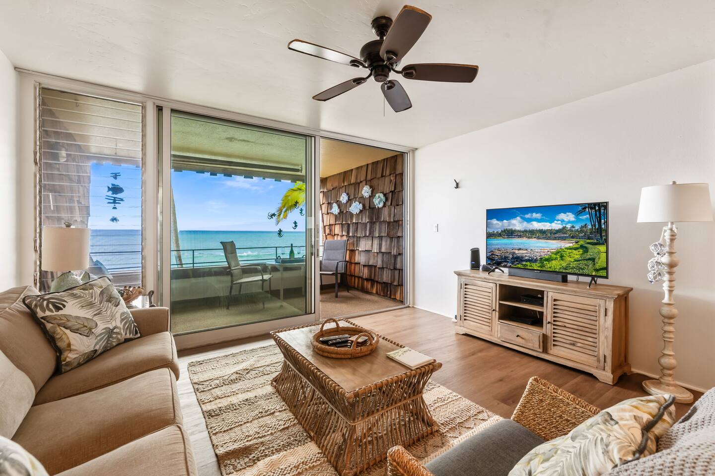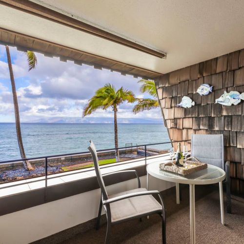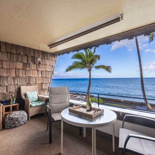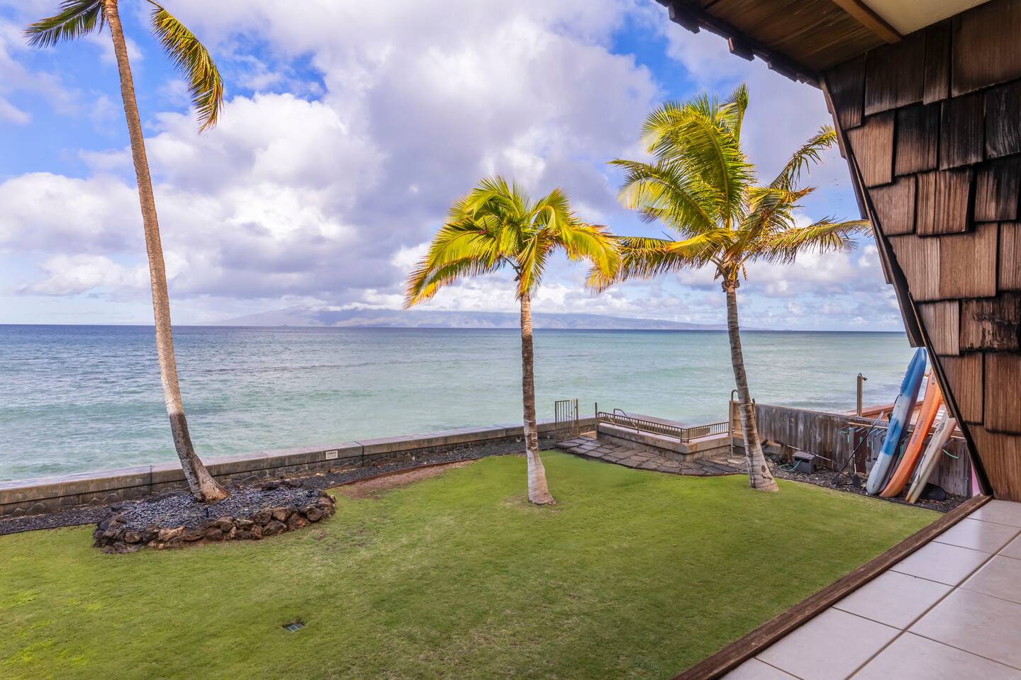 Spacious, shaded lanai with dining table for 4 and unobstructed oceanfront views — perfect for morning coffee or sunset dining.