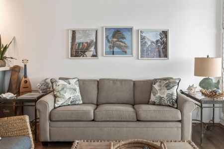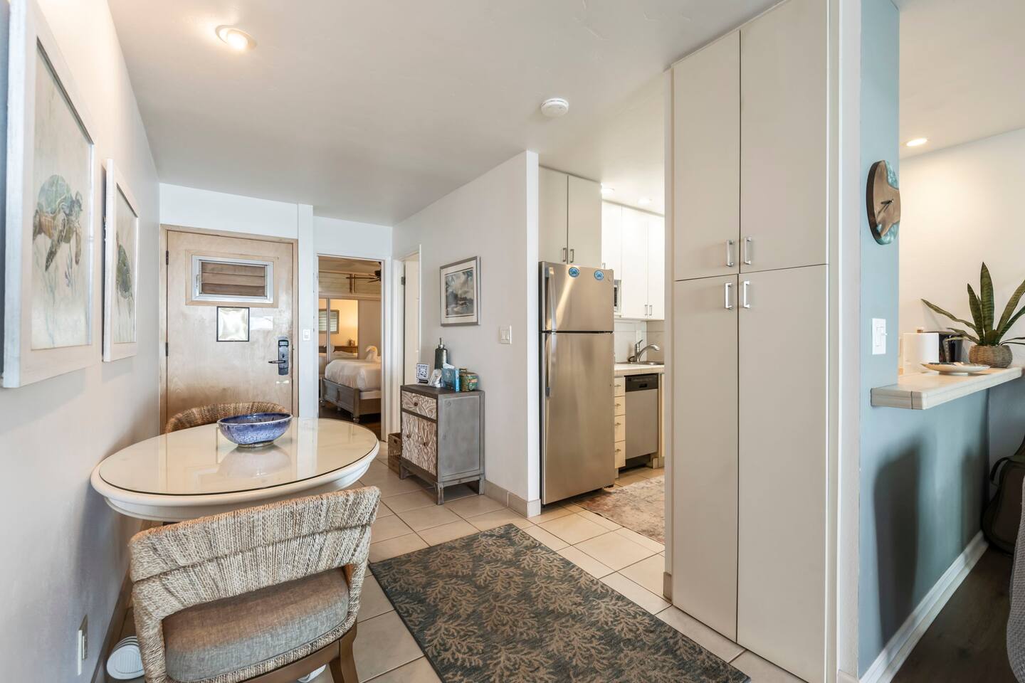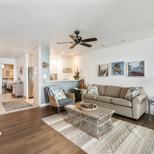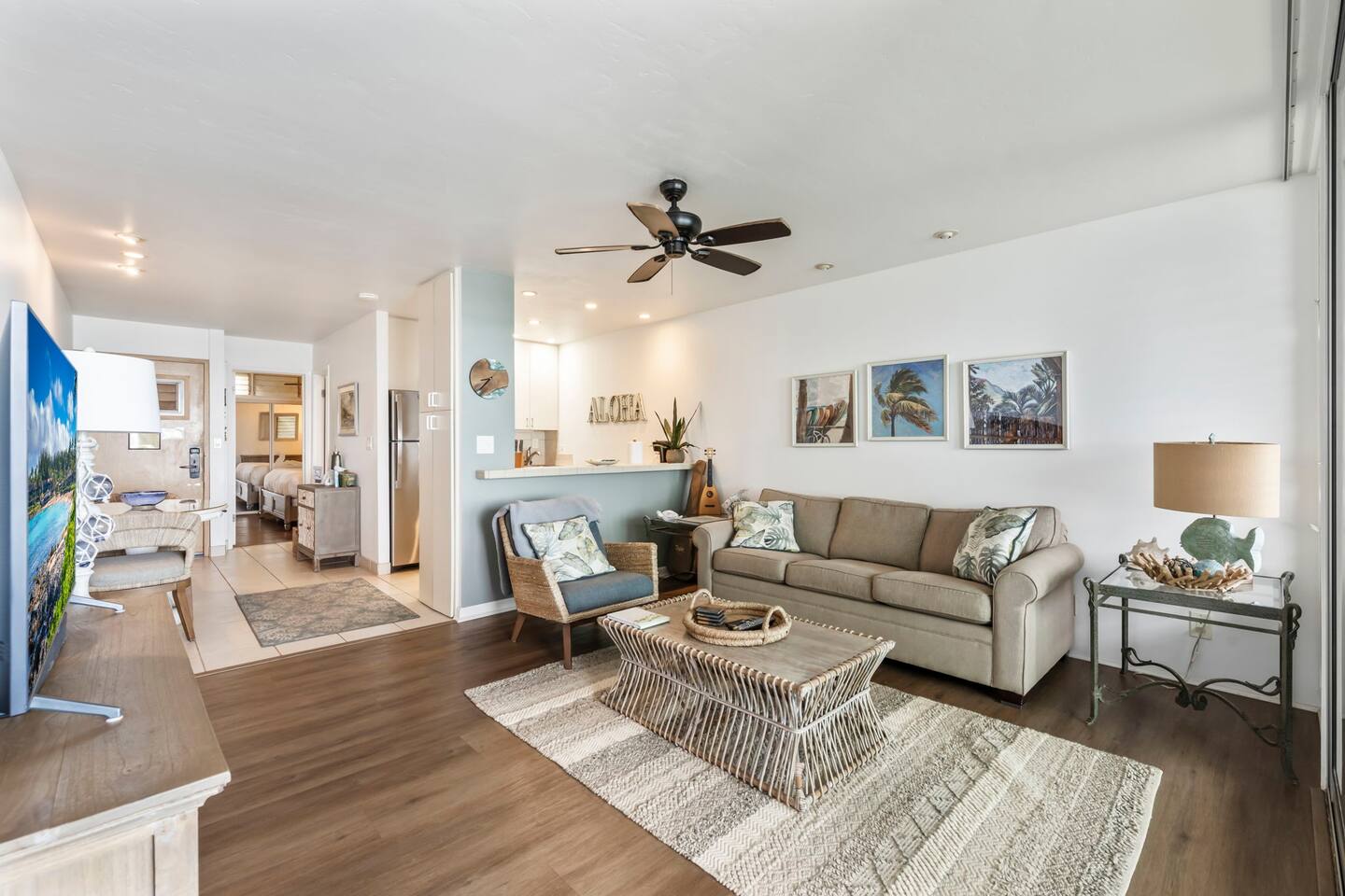 Open floor plan with fully equipped kitchen, dining table, Smart TV with cable, sofa sleeper, and sitting chair. There is NO AC at this unit. There are ceiling fans in every room and a light coastal breeze.
