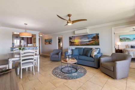 Open-concept layout with coastal décor and split A/C. Fully equipped kitchen, dining for 6, large Smart TV with cable, sofa sleeper, and two sitting chairs.