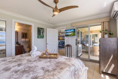 King bed, dresser, Smart TV with cable, split A/C, plantation shutters, ceiling fan, and direct lanai access.
