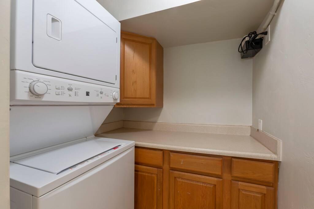 In-unit washer/dryer with laundry essentials and folding counter space.