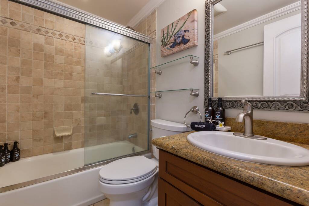 Tub/shower combo, single-sink vanity with storage, and toilet.