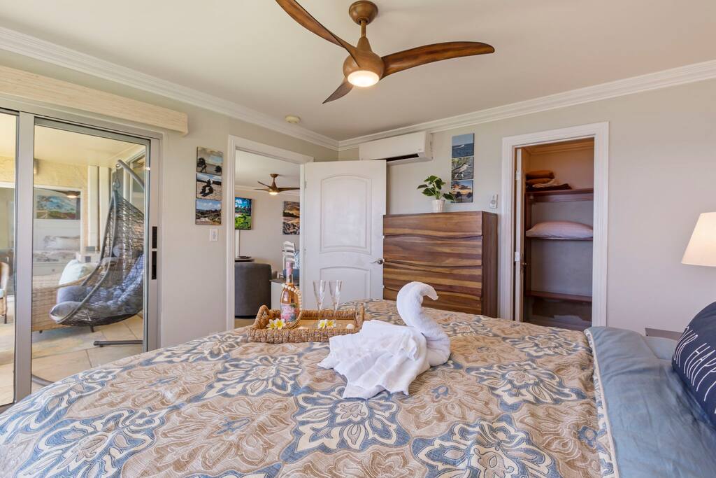 King bed, dresser, walk-in closet, TV, plantation shutters, ceiling fan, split A/C, and lanai access.