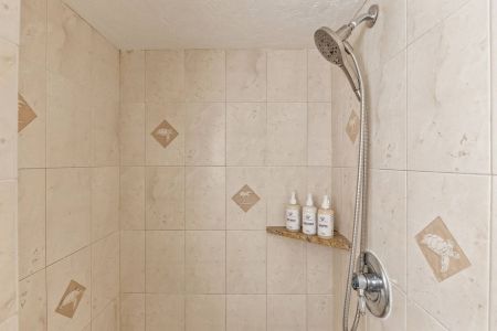 Bathroom: Walk-in shower, toilet, and single vanity sink with storage.
