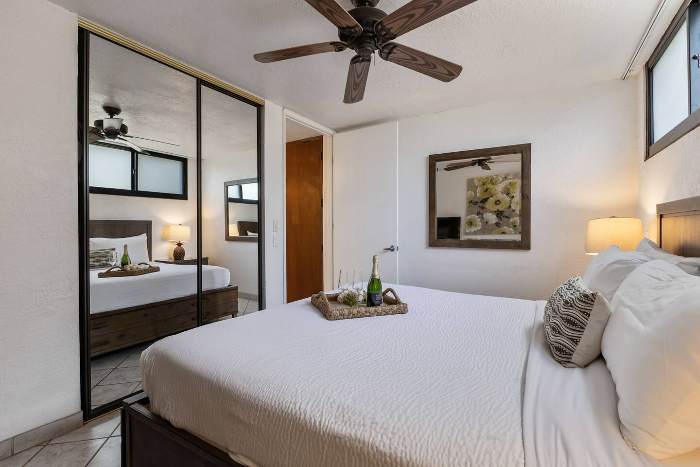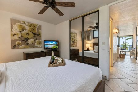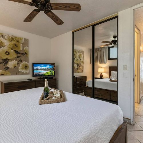 Bedroom: King-size bed, TV with cable, closet space, and ceiling fan.