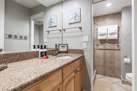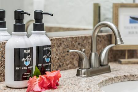 Walk-in shower, single-sink vanity with storage, and Stay Aloha’s luxury organic bath products.