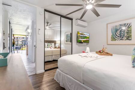 King-size bed with premium linens, Smart TV, USB-charging nightstands, ceiling fan, and closet storage.