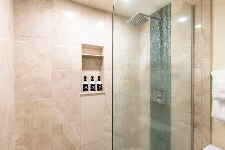 Accessible from the main living area; features a walk-in shower, single-sink vanity, fresh towels, and luxury organic bath products courtesy of Stay Aloha.