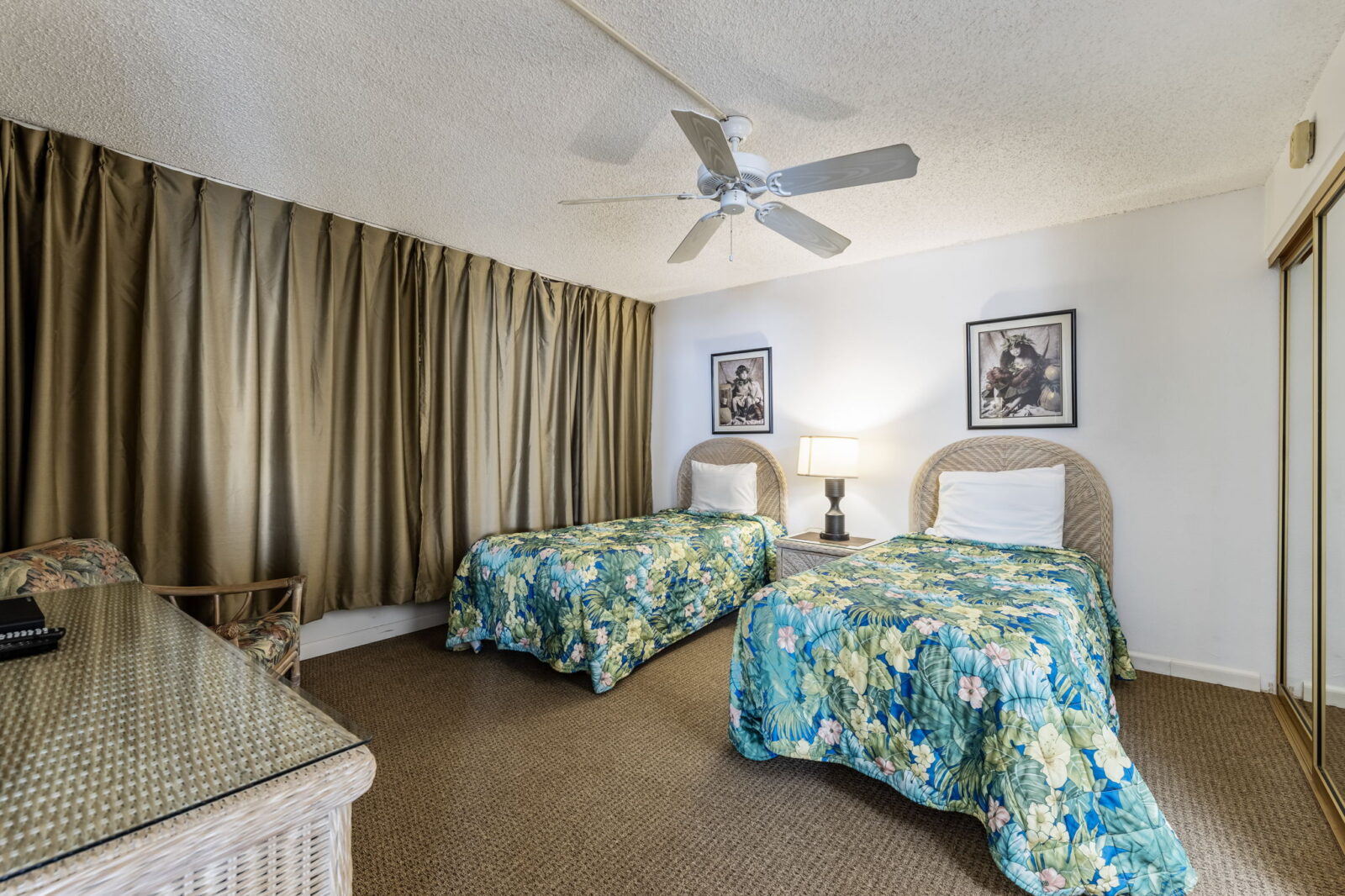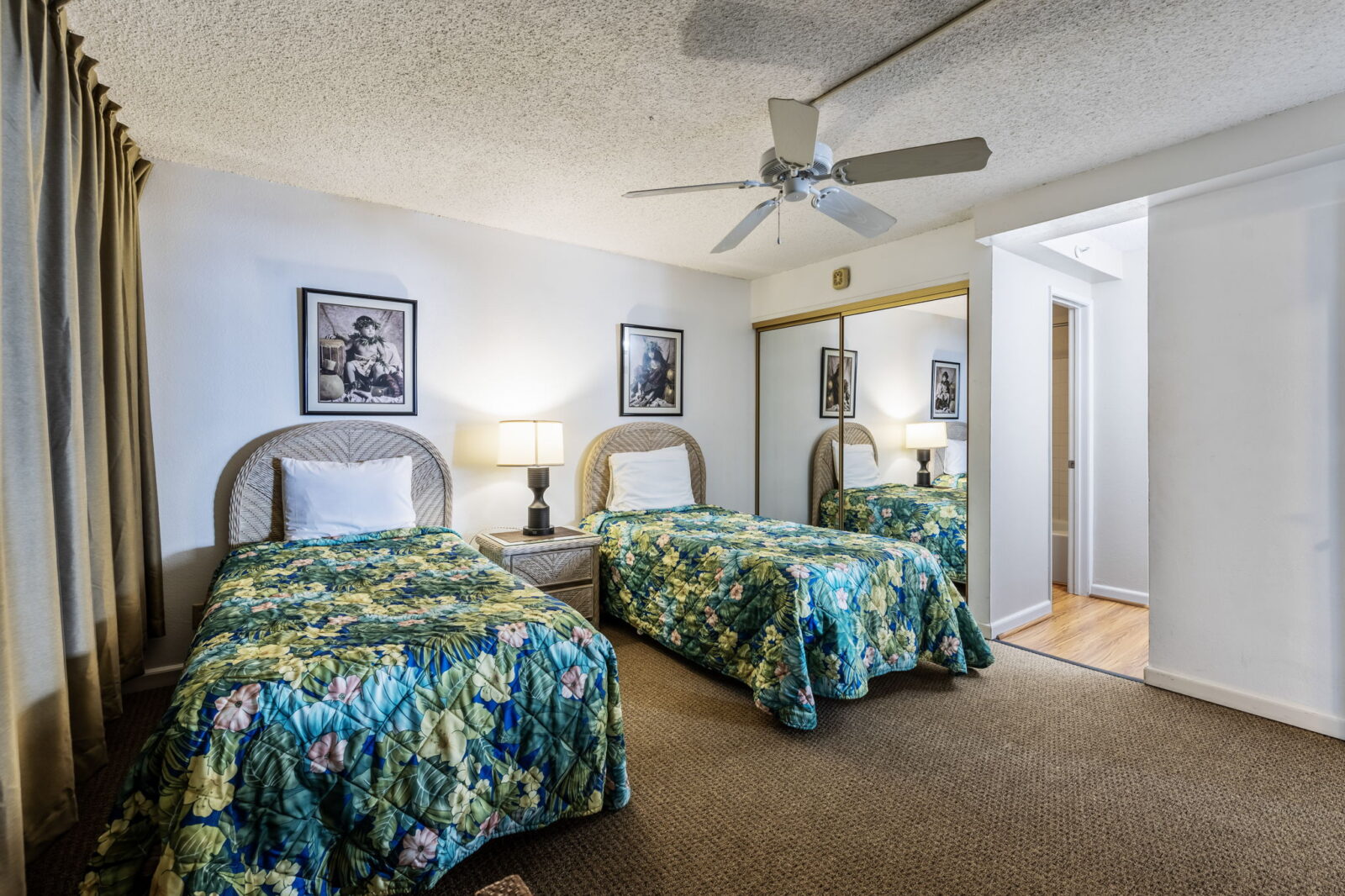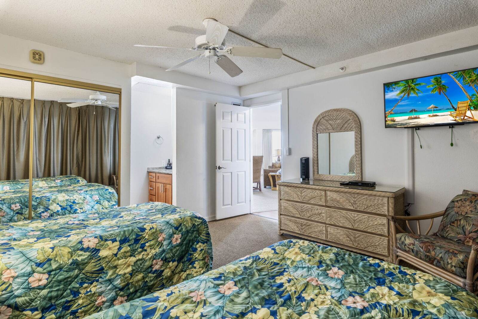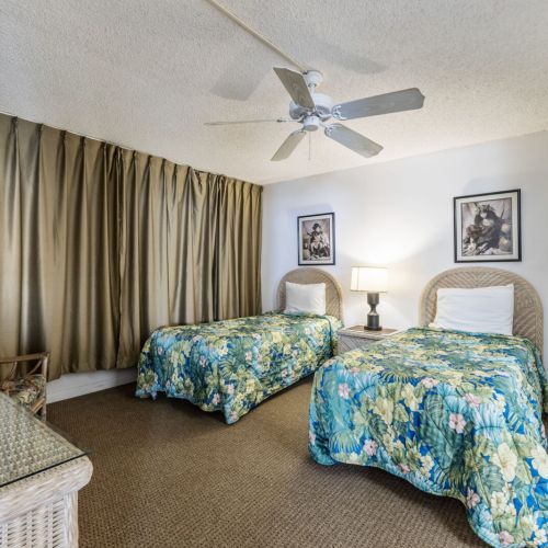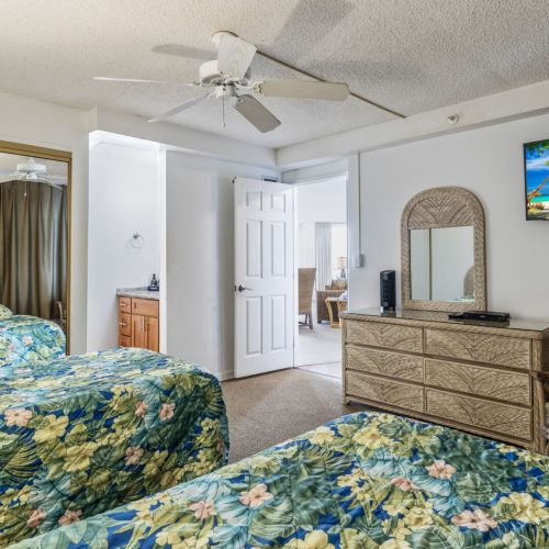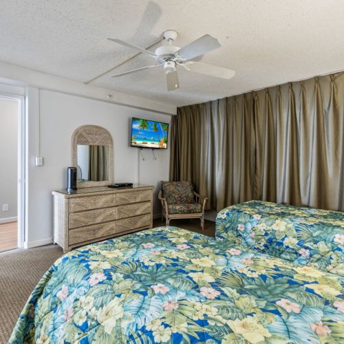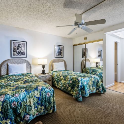 Two twin beds, dresser, two nightstands, TV with cable, and ceiling fan.