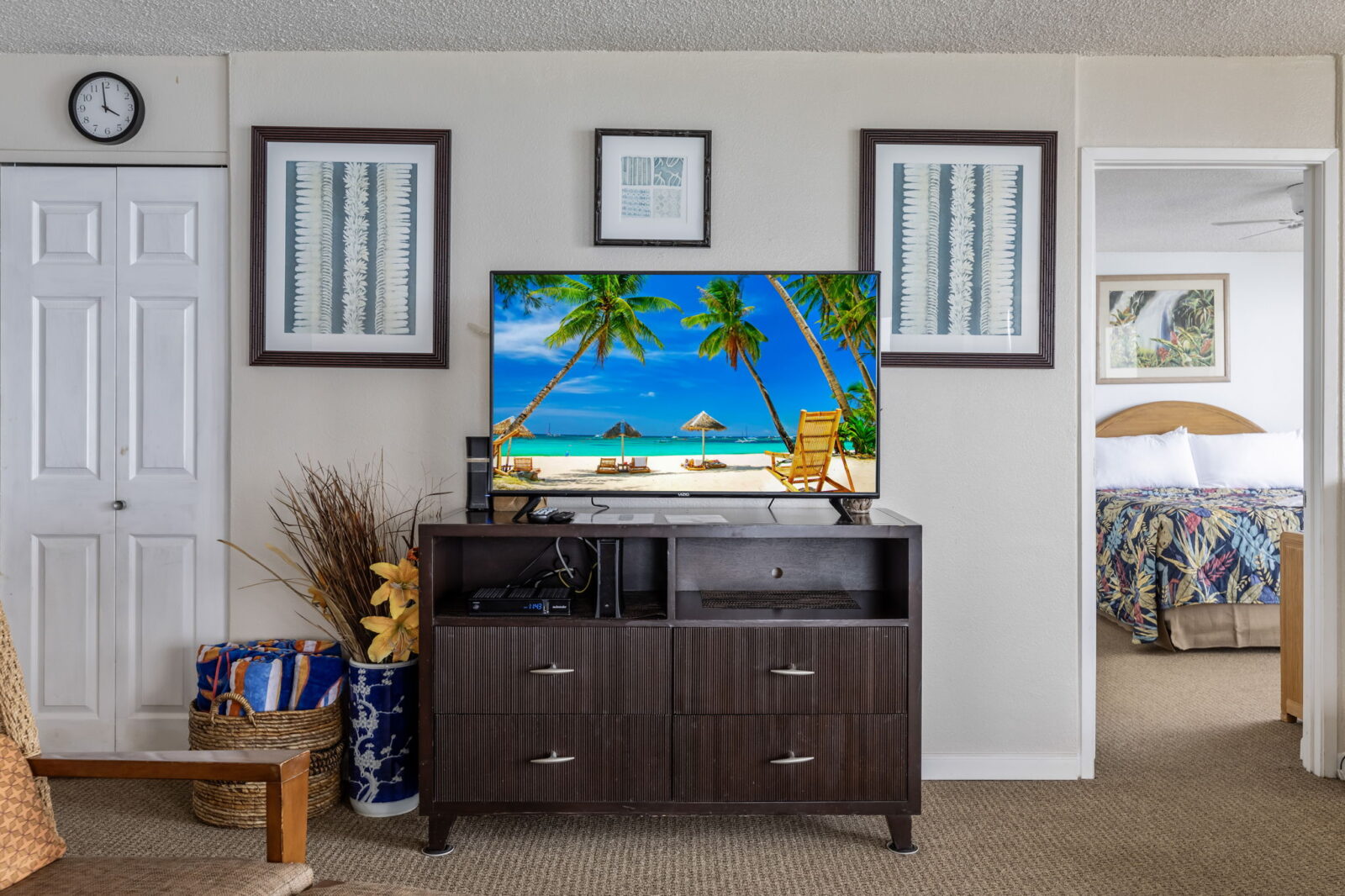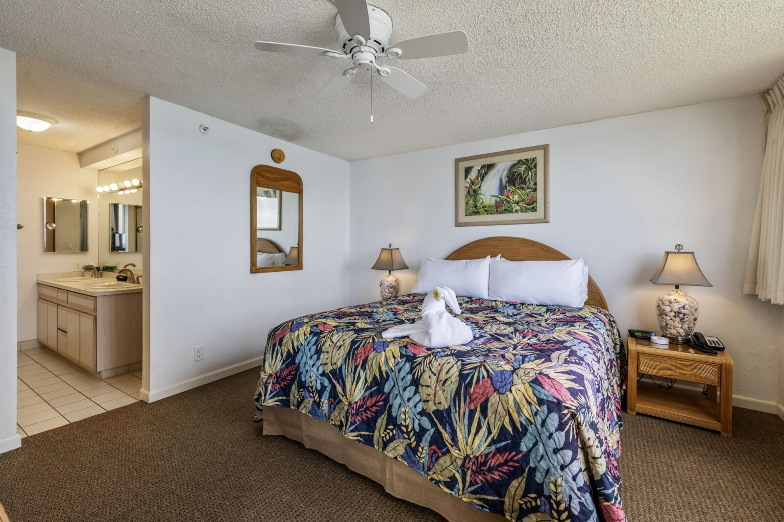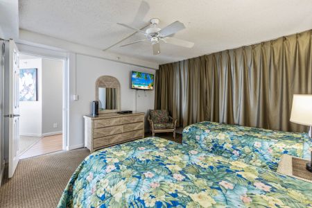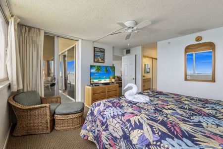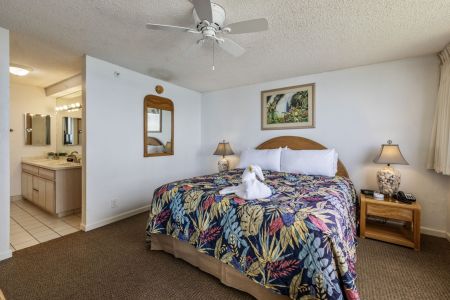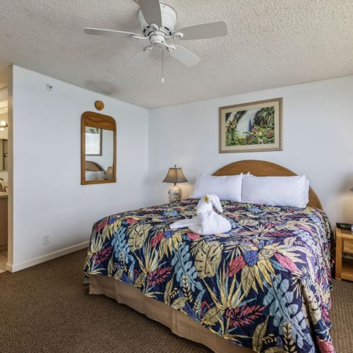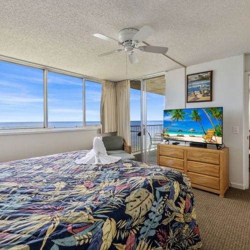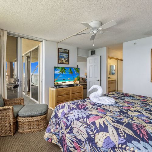 King-size bed, dresser, two nightstands, TV with cable, ceiling fan, and direct lanai access.