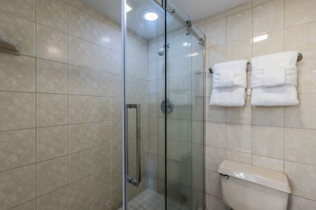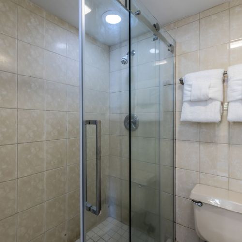En suite bathroom with walk-in shower, single sink vanity, and fresh towels.