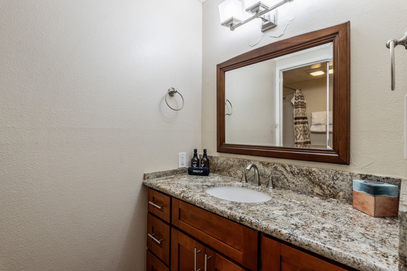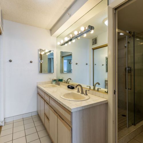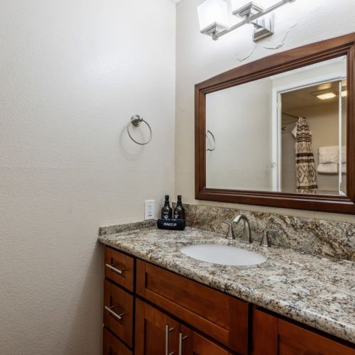 En suite bathroom features a walk-in shower, single sink vanity, and luxury organic bath products courtesy of Stay Aloha.