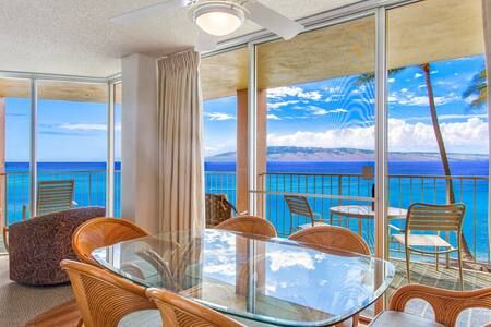 Massive wraparound lanai with panoramic ocean views — perfect for whale watching, sunsets, and morning coffee.
