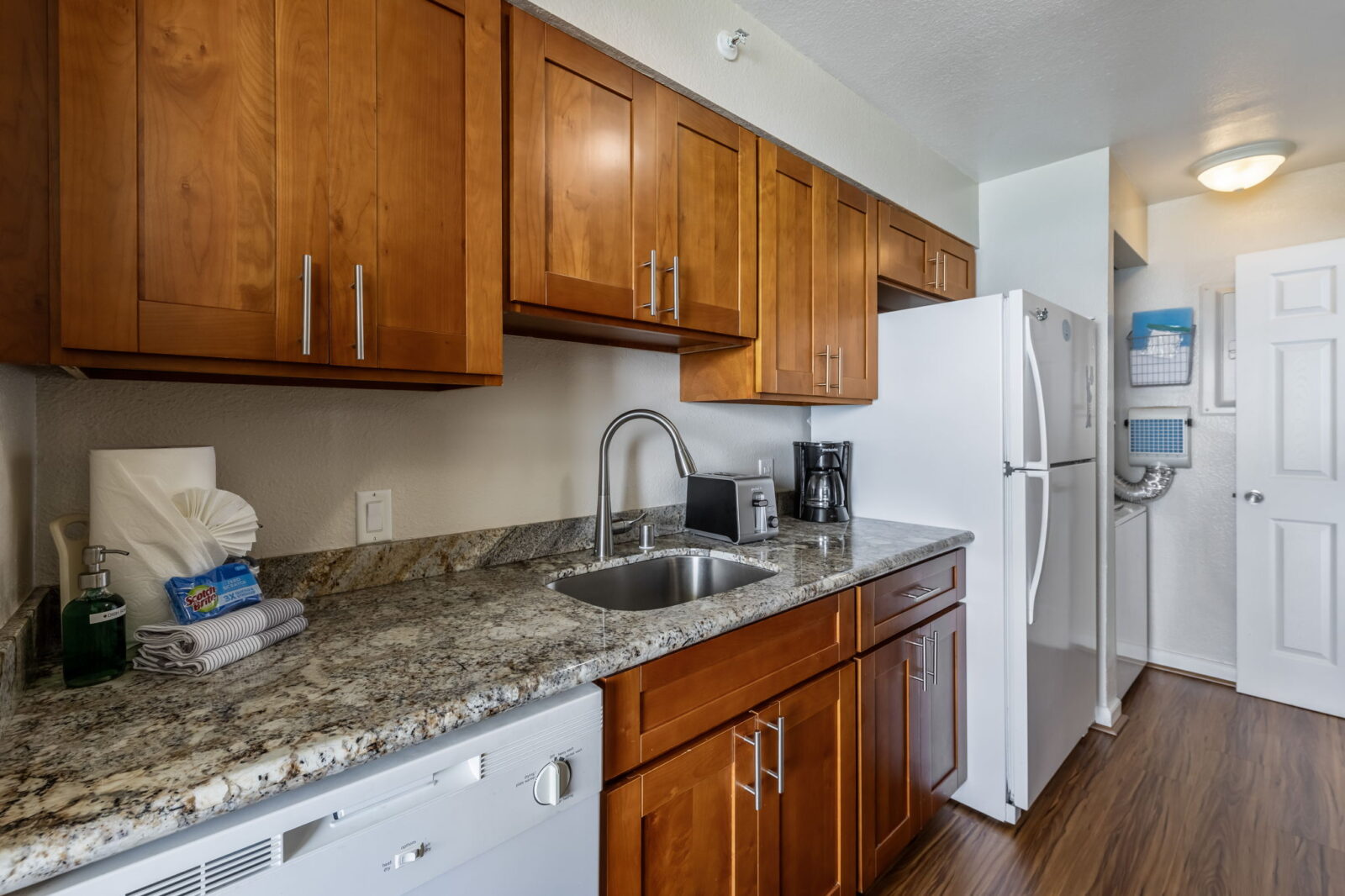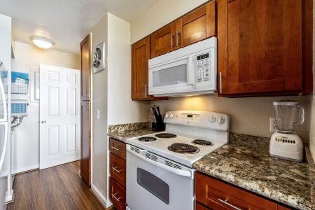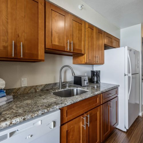 • Fully equipped kitchen, in-unit washer/dryer, and central A/C