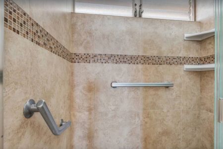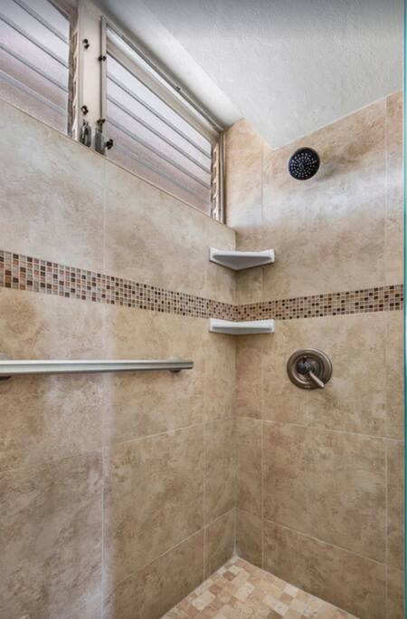 Accessible from both the bedroom and living room. Features a walk-in shower, single sink vanity, fresh towels, and Stay Aloha’s luxury organic bath products.